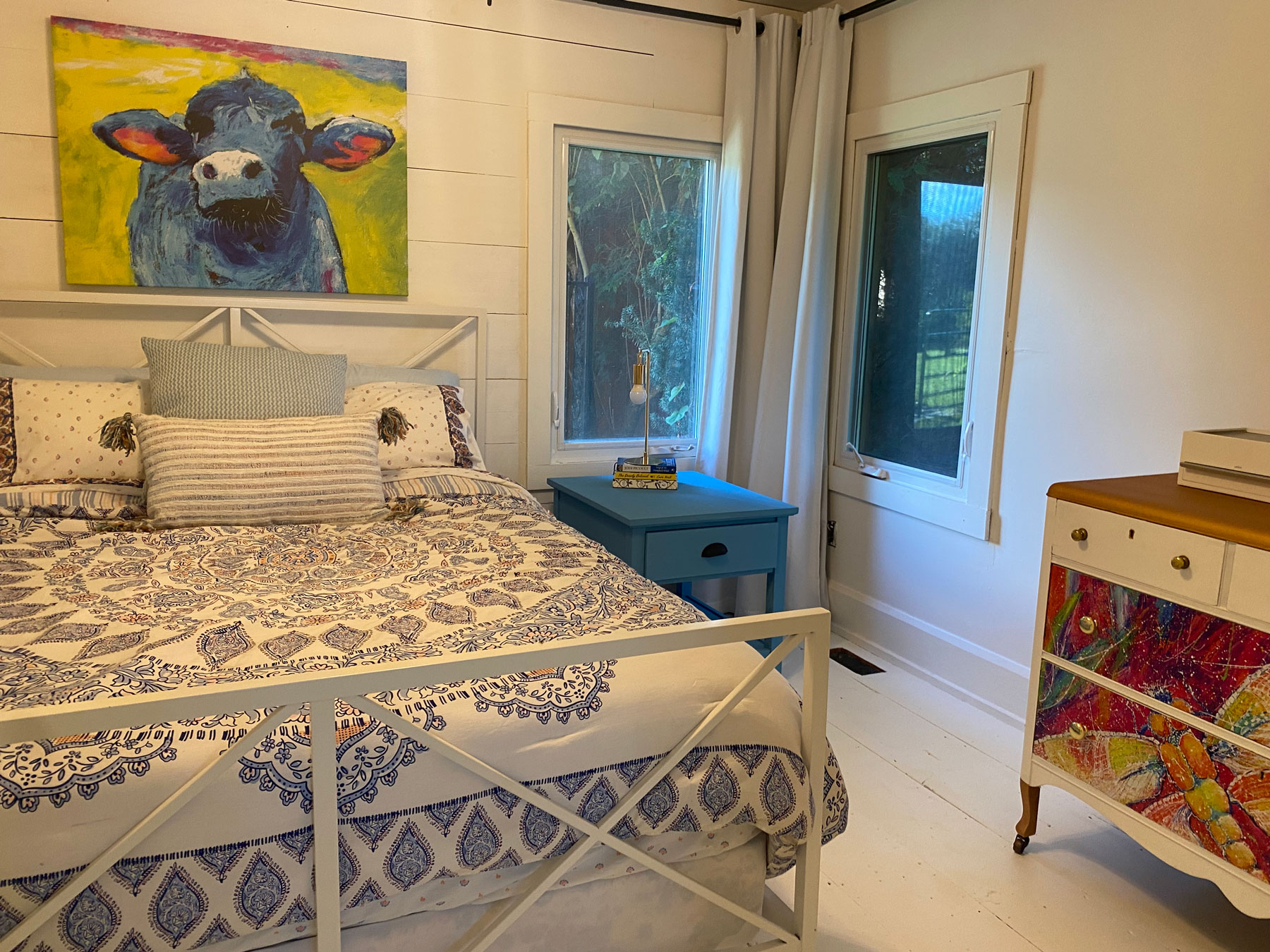 A cozy bedroom with queen sized bed and wake up to a view of the lake.
