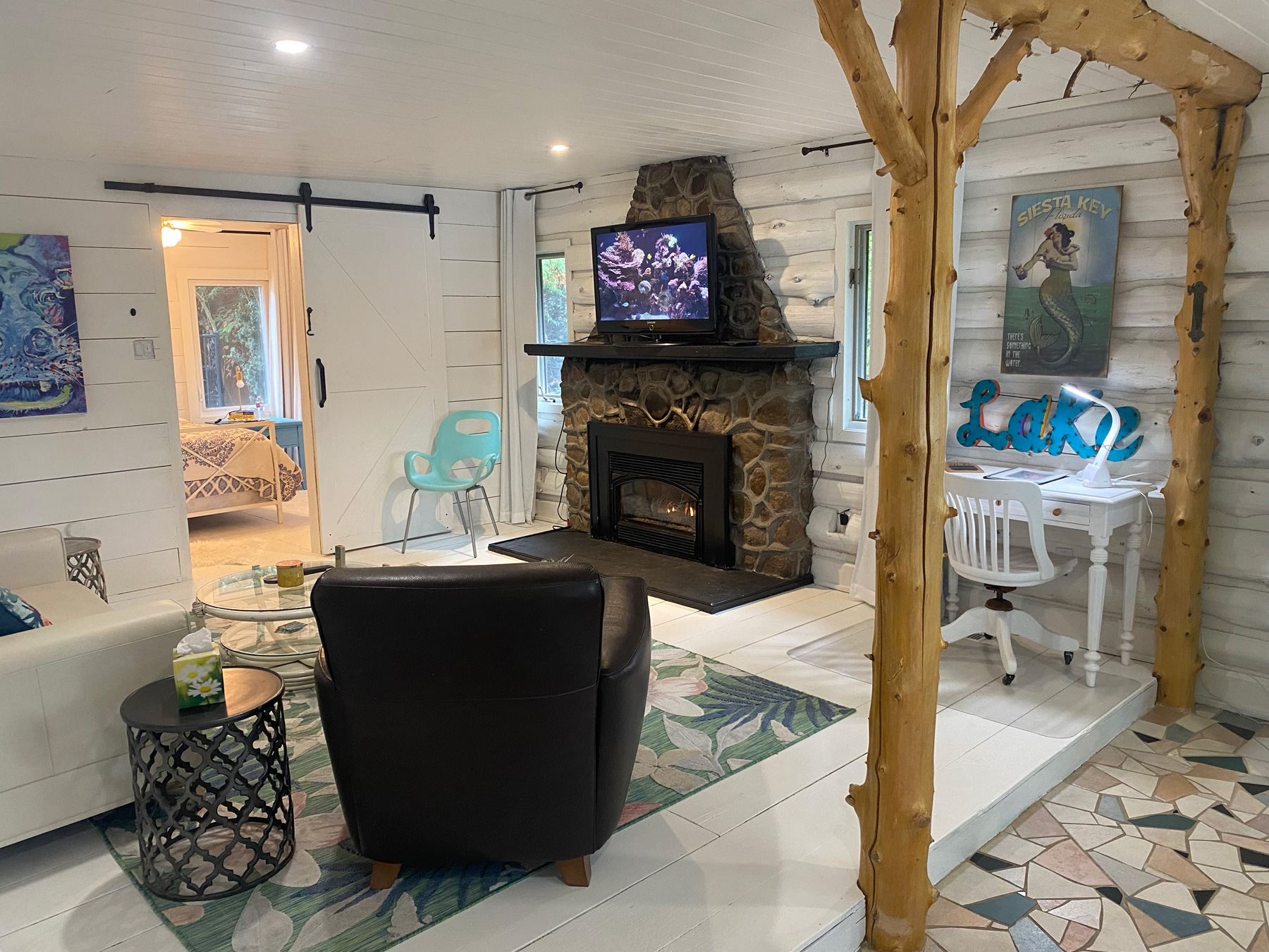 spacious living room with gas fireplace and premium digital TV and high speed Wifi and a desk to work from...